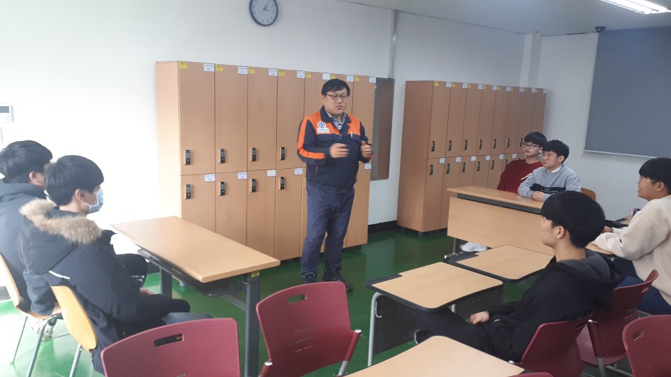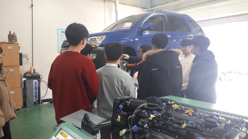 자동차에 관련된 강의(이론, 실습)를 듣고 있는 모습이다.