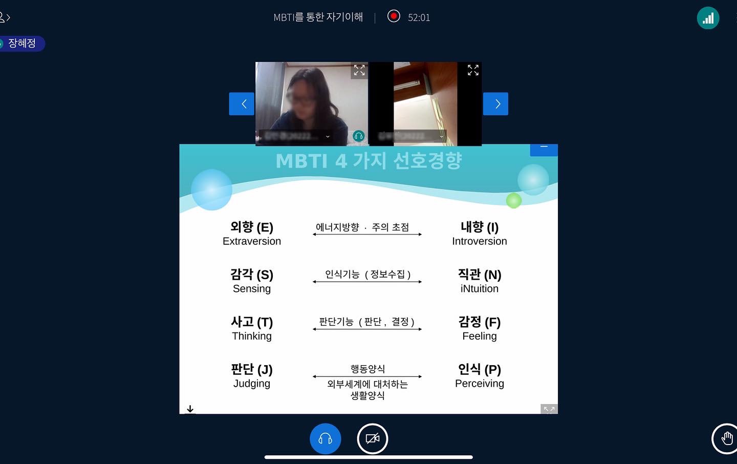 - 내용 : MBTI 성격 유형 검사를 통하여 자신의 선천적 선호 경향성을 알아보는 심리검사를 진행하였습니다. 검사지 속 문항에 체크하며 자신의 MBTI를 알아보고, 자신의 유형에 관한 글을 읽어보며 이야기나누는 시간을 가졌습니다.