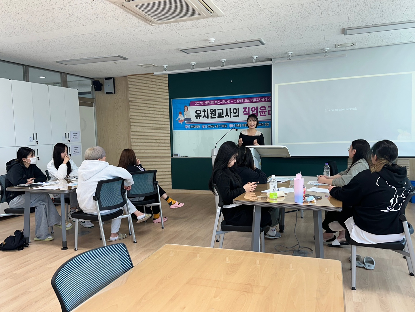 유치원교사의 직업윤리- 일시 : 2024년 4월 17일- 강사 : 채승현 원장님- 대상 : 유아교육과 2학년- 장소 : 서강관 403호- 내용 : 교사와 영유아교사란 무엇인가와 교육윤리, 윤리강령에 대한 정의에 대하여 배우고 윤리적 딜레마에 사례들을 통해 토론하는 시간을 가지게 되었습니다.