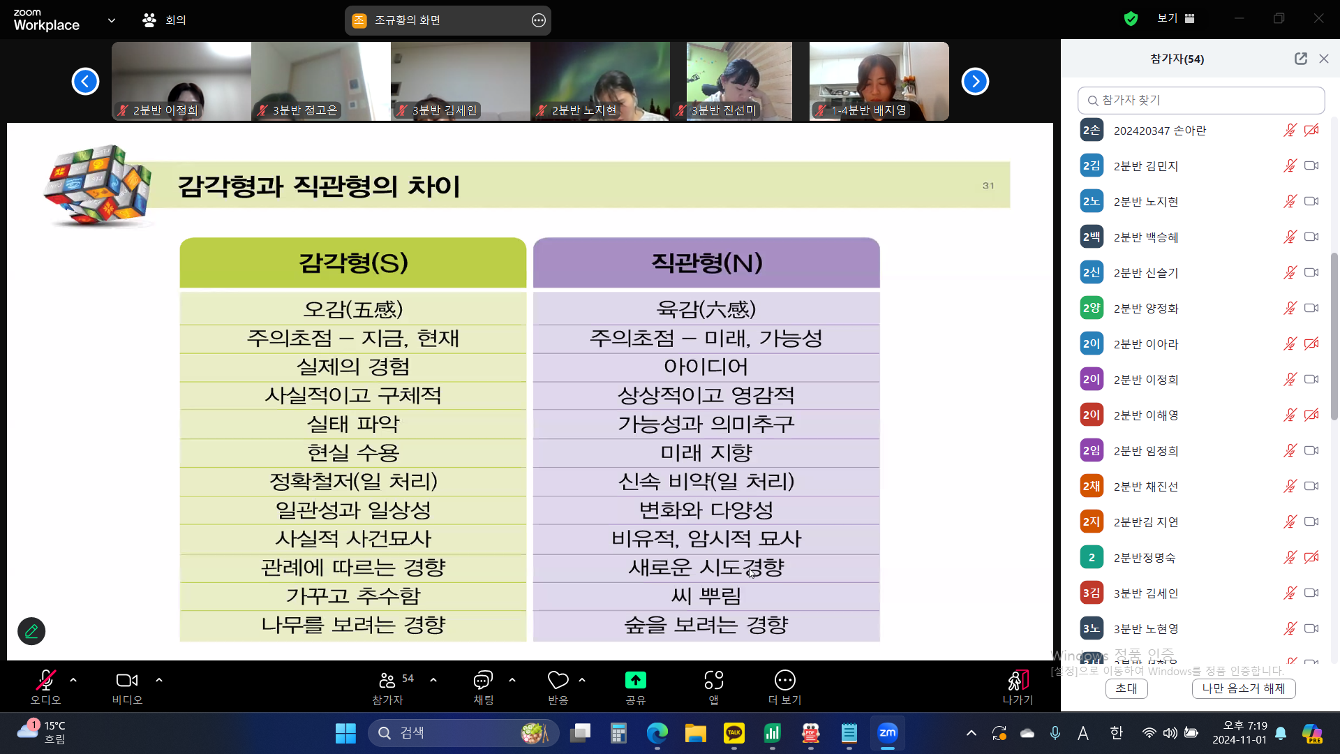 - 내용 : MBTI 성격 유형 검사를 통하여 자신의 선천적 선호 경향성을 알아보는 심리검사를 진행하였습니다. 검사지 속 문항에 체크하며 자신의 MBTI를 알아보고, 자신의 유형에 관한 글을 읽어보며 이야기나누는 시간을 가졌습니다.