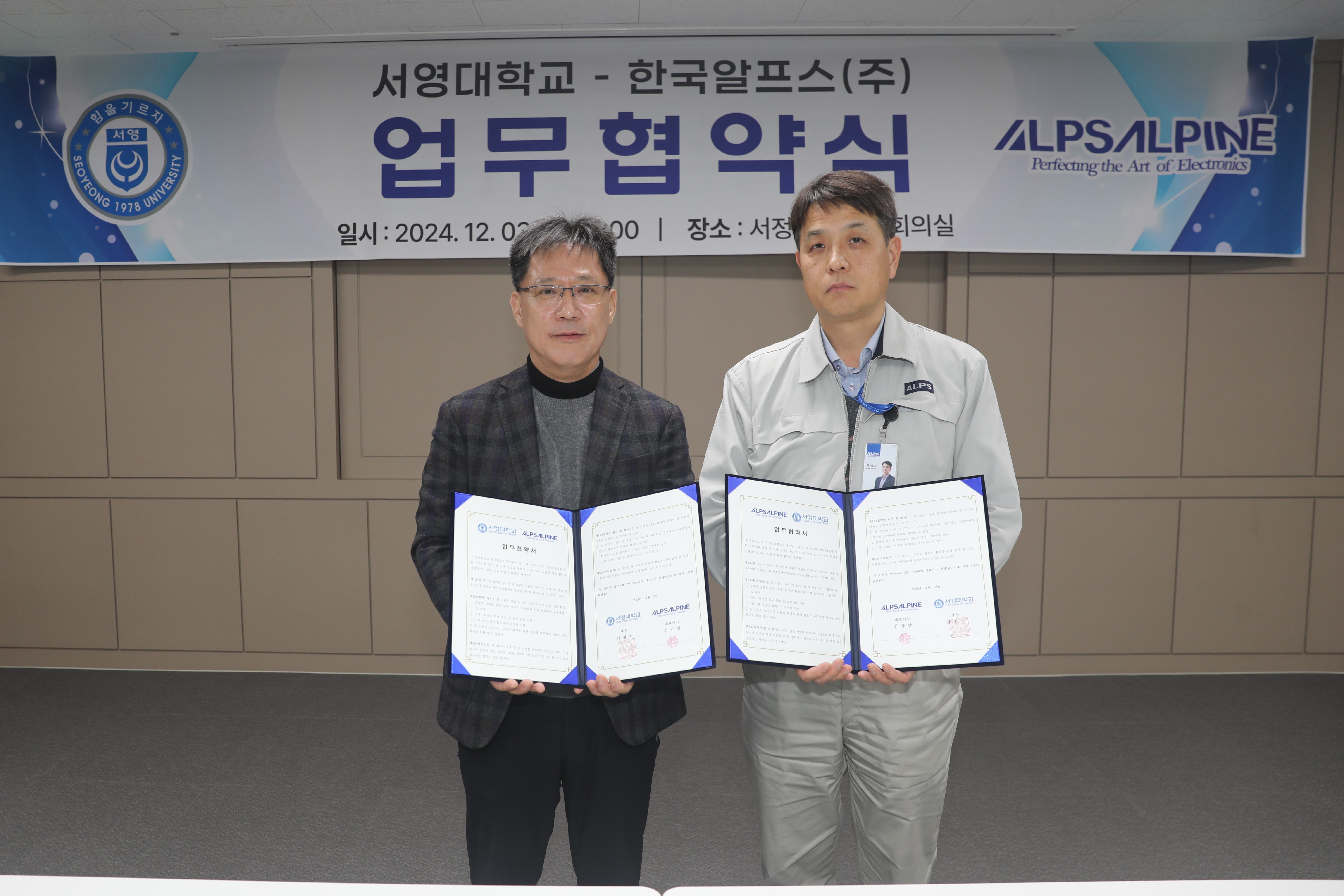 2024년 12월 3일 서영대학교는  지역정주형 외국인력 양성 및 인력공급 확대를 위해 한국알프스(주)와 업무협약을 체결하였습니다. 이번 협약을 통해 두 기관은 국내·국인 학생들을 위한 교육과정 공동개발 및 운영, 취업 정보 지원 등에 협력하기로 하였습니다.