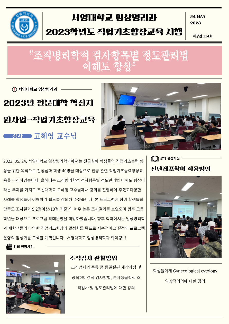 서영대학교 임상병리학과에서는 전공심화 학생들의 직업기초능력 향상을 위한 목적으로 전공심화 학생 40명을 대상으로 전공 관련 직업기초능력향상교육을 추진하였습니다. 올해에는 조직병리학적 검사항목별 정도관리법 이해도 향상이라는 주제를 가지고 조선대학교 고혜영 교수님께서 강의를 진행하여 주셨고다양한 사례를 학생들이 이해하기 쉽도록 강의해 주셨습니다. 본 프로그램에 참여 학생들의 만족도 조사결과 9.2점이상(10점 기준)의 매우 높은 조사결과를 보였으며 향후 모든 학년을 대상으로 프로그램 확대운영을 희망하였습니다. 향후 학과에서는 임상병리학과 재학생들의 다양한 직업기초향상의 활성화를 목표로 지속적이고 질적인 프로그램운영의 활성화를 모색할 계획입니다. 서영대학교 임상병리학과 화이팅!!!