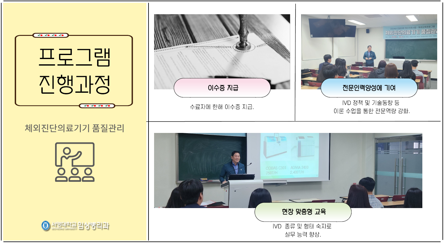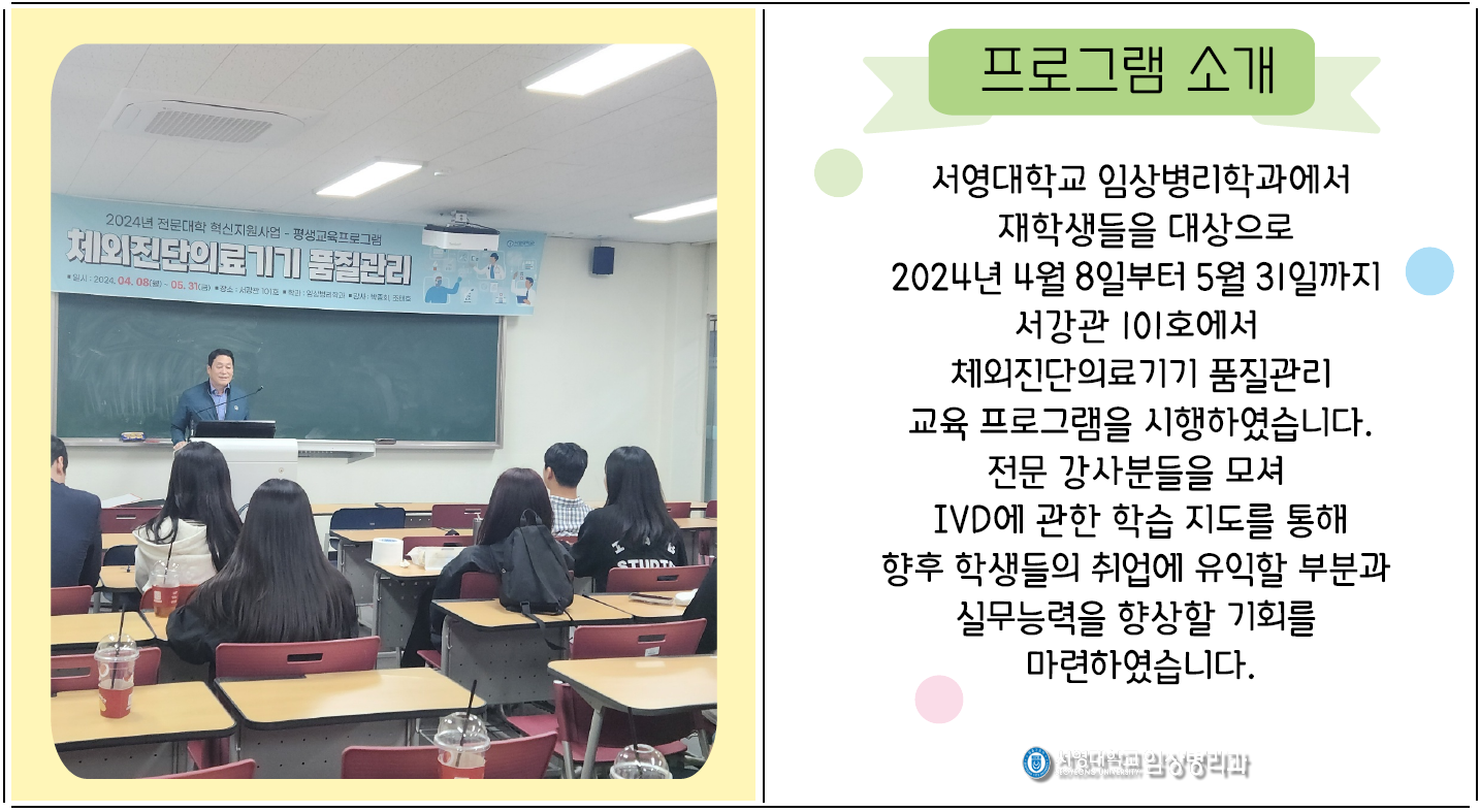서영대학교 임상병리학과에서 재학생들을 대상으로 2024년 4월 8일부터 5월 31일까지 서강관 101호에서 체외진단의료기기 품질관리 교육 프로그램을 시행하였습니다. 전문 강사분들을 모셔 IVD에 관한 학습 지도를 통해 향후 학생들의 취업에 유익할 부분과 실무능력을 향상할 기회를 마련하였습니다.