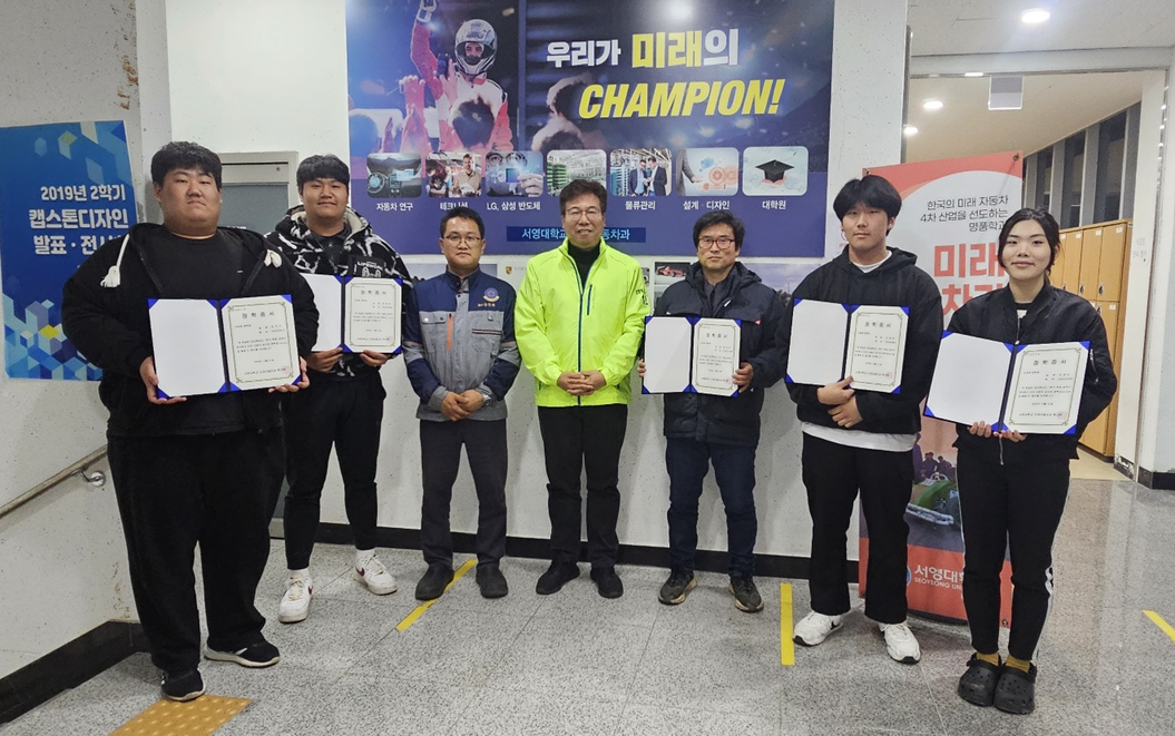 서영대학교는 교육부 평가 "자율개선대학"으로 매학기 국가장학금 1, 2유형이 재학생들에게 지급되고 있으며 다양한 교내 장학금도 학기 별 많은 학생들에게 지급되고 있습니다. 미래자동차과 자체로는 학과 협력 산업체인 (주) 모터원, (주)천우모터스, (주)케이씨씨오토그룹, (주)인천오토컴퍼니, (주)한서이엔에스 등 에서 다양한 장학금이 학생들에게 지급되고 있습니다. 2023년 2학기 산업체 장학금은 1학년 권 * 근, 장 * 준, 이 * 명, 4학년 이 * 한 군 등은 각각 100만원, 1학년 조 * 진 양, 2학년 김 * 덕, 3학년 서 * 영 군은 각각 50만원씩 지급되었습니다. 장학금을 받는 학생들은 학기 중 성실히 학교생활을 하고 다른 학생들의 모범이 되어 담당 교과목 수업 교수님들의 추천을 통해 선발 되었습니다.