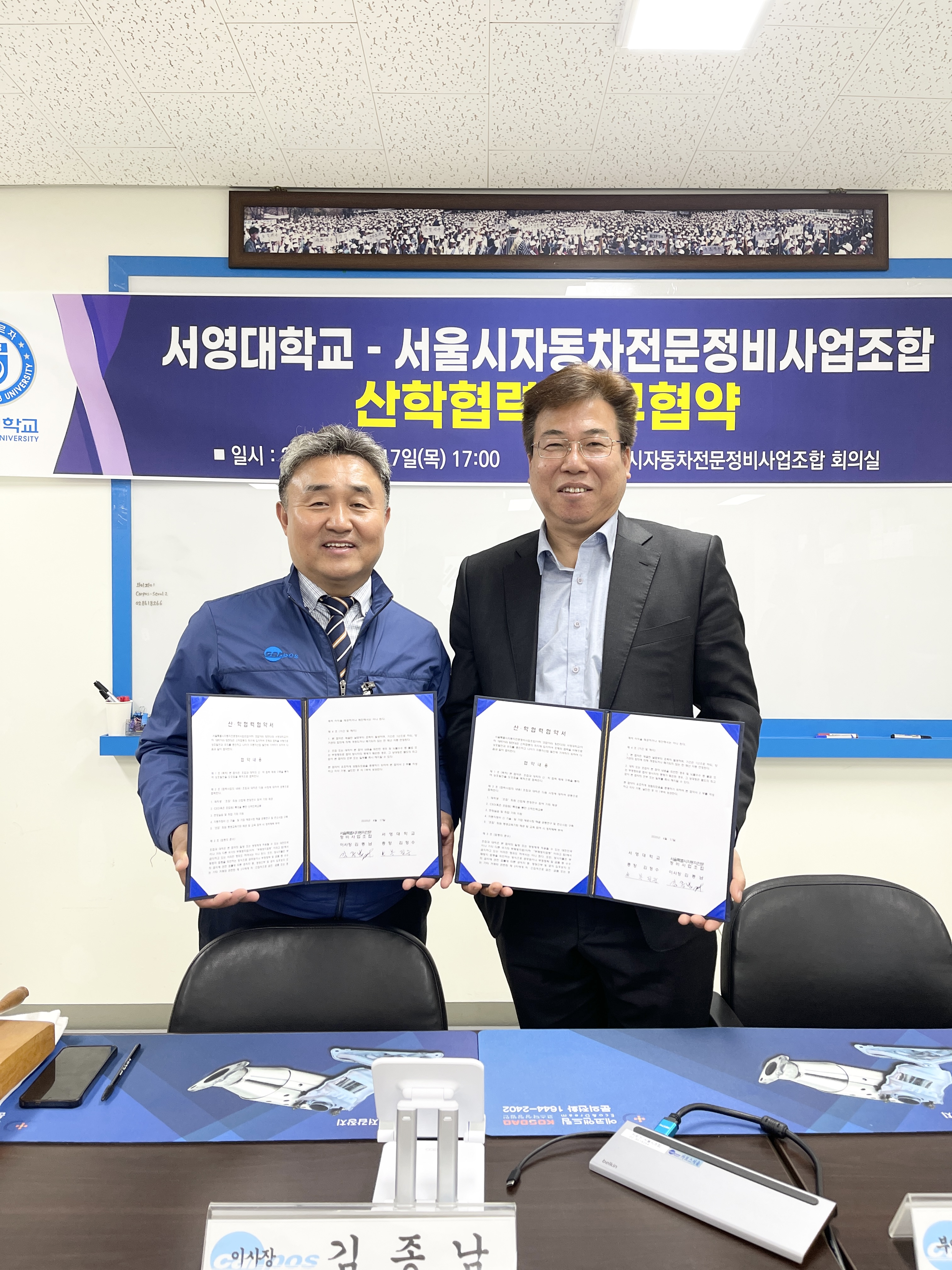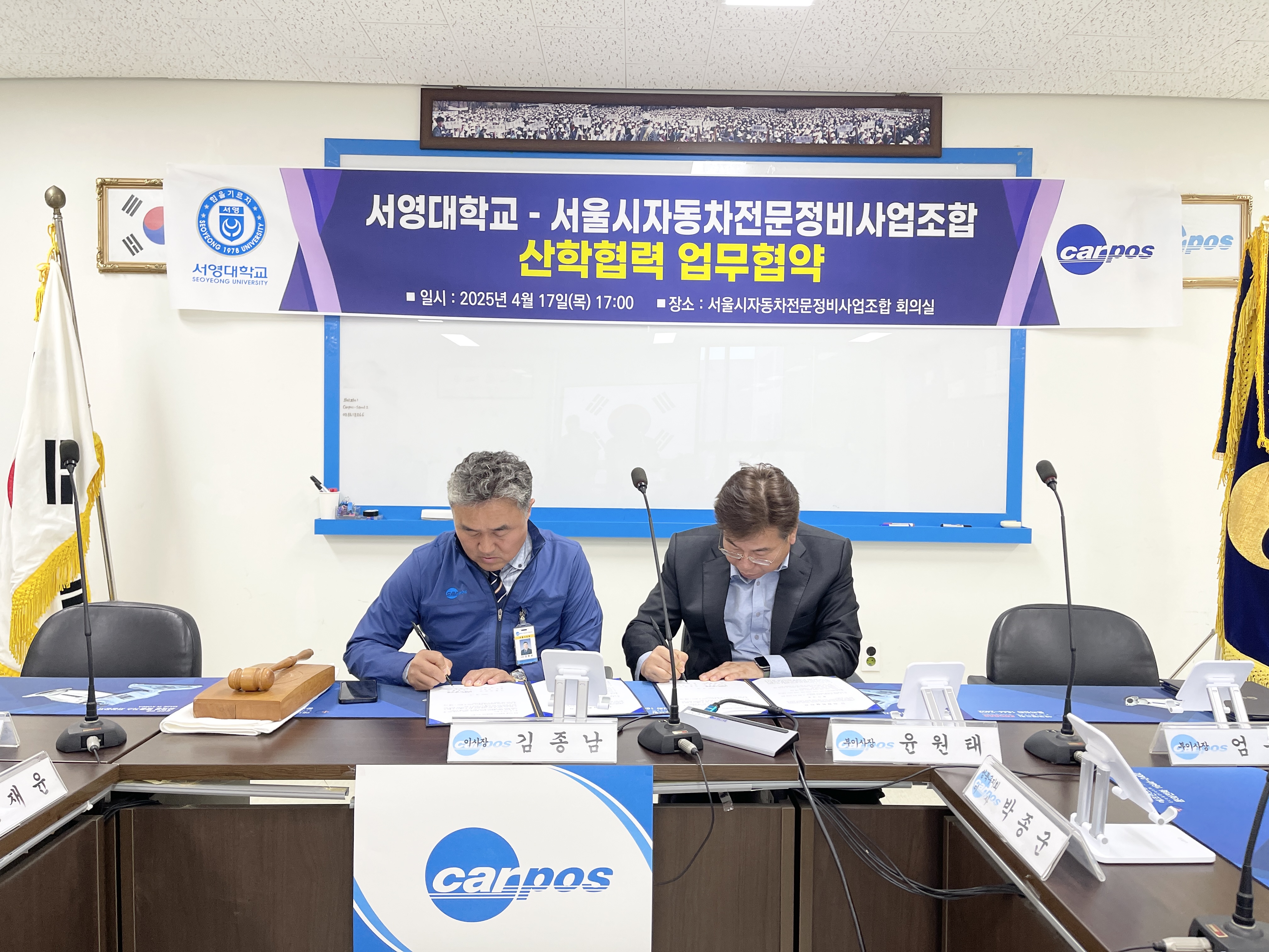 서울시자동차전문정비사업조합 회의실에서 진행된 업무 협약식에는  서울시 자동차전문정비사업조합 김*남 이사장님을 비롯하여 소*원 수석부이사장, 윤*태 부이사장, 엄*택 부이사장, 김*한 전무이사 등 관계자 분들이 참석해 자리를 빛내주셨습니다.