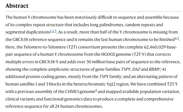 Rhie, A., Nurk, S., Cechova, M. et al. The complete sequence of a human Y chromosome. Nature (2023).