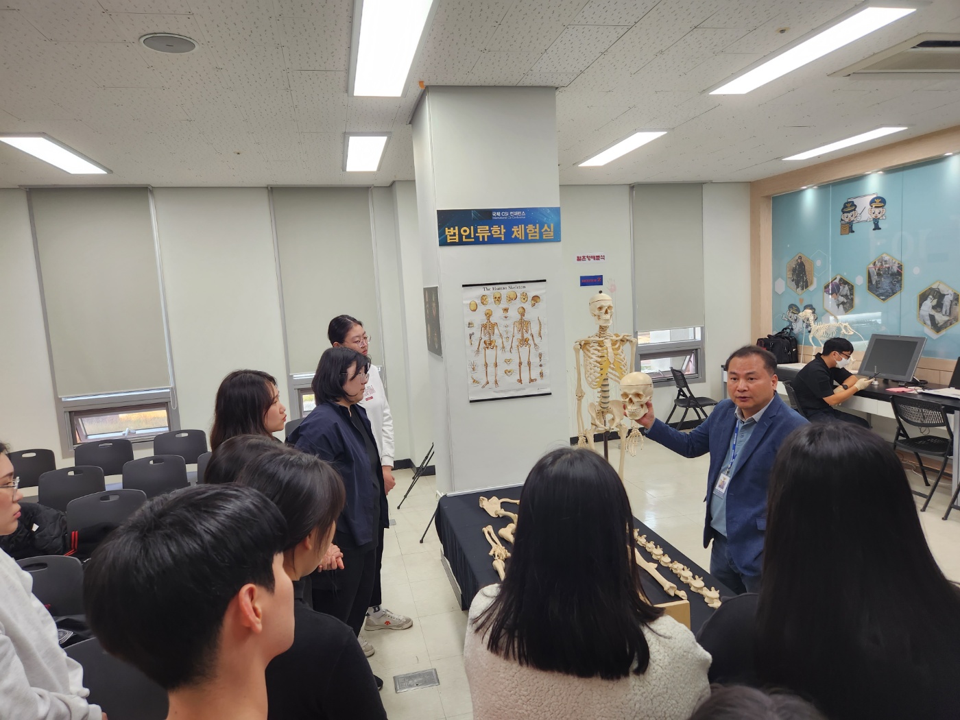 과학 수사 체험교실에서 법인류학 개요, 혈흔형태분석, 지문감정, DNA분석, 법최면· 몽타주, 프로파일링, 문서감정, 폴리그래프 등의 분야에 대한 다양한 수사기법 교육 및 실습이 2시간 가량 진행되었다. 이 날 교육을 위해 경기북부경찰청 과학수사팀에 재직 중인 김영삼 팀장님이 수고해주셨다.