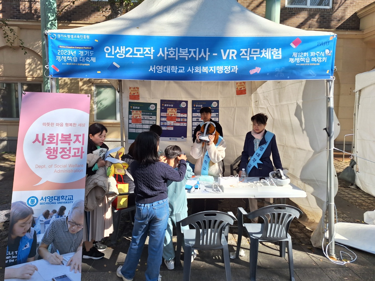 저희 교수님들 인솔하에 사회복지행정과 1,2학년 학생들이 VR을 활용한 직무제험(인생 2모작)이라는 주제로 체험부스를 운영하였습니다.